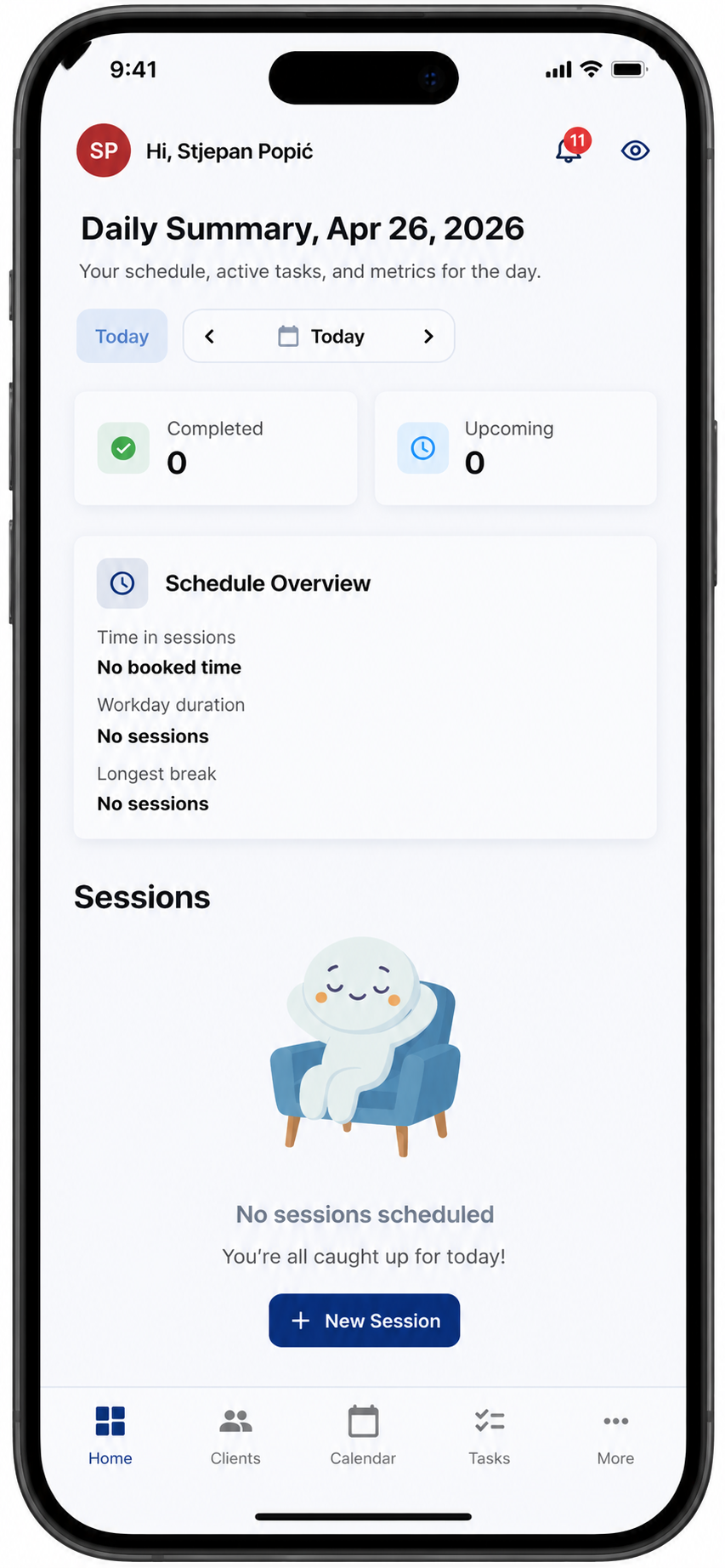 Check appointments, recurring sessions, and what is coming next.